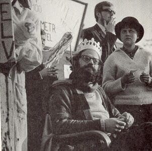 On May 1st 1965, he was crowned "King of May" by an enthusiastic crowd in Prague town square (Výstaviště), in Communist Czechoslovakia. Soon undercover police halted the festivities and un-crowned him. Prague secret police took this photograph (below) of him (with young Czech poet Pavel Beran) on Wencislas Square. A few days later they seized his journals and summarily deported him"