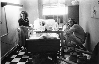 ["Turned at door to say good -bye to Julian Beck, Medical Arts Center West 57th street Manhattan, October 1984 wife actress Judith Malina and trouper Hanon of their Living Theater by his bed. Cancer of abdominal wall, yet he rose for another year of stage works, grave in Zurich to declaim the latter's statement of the state as jail of human spirit, smoke a joint and break the laws of death." (Ginsberg caption.) photo c Allen Ginsberg Estate]